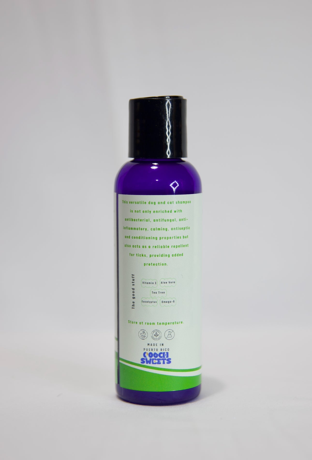 Packed with antibacterial, antifungal, anti-inflammatory, and antiseptic properties, our shampoo effectively cleanses and nourishes your pet's coat and skin, promoting overall health and well-being. The calming properties of tea tree and eucalyptus soothe irritated skin, providing relief from itchiness and discomfort.
